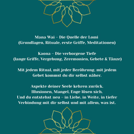 Empfange drei weiteren Aspekte der Lomi Lomi Nui – auf deinem Weg, den du mit Kaona gehst, wenn du dich dieser heiligen Berührung öffnest.